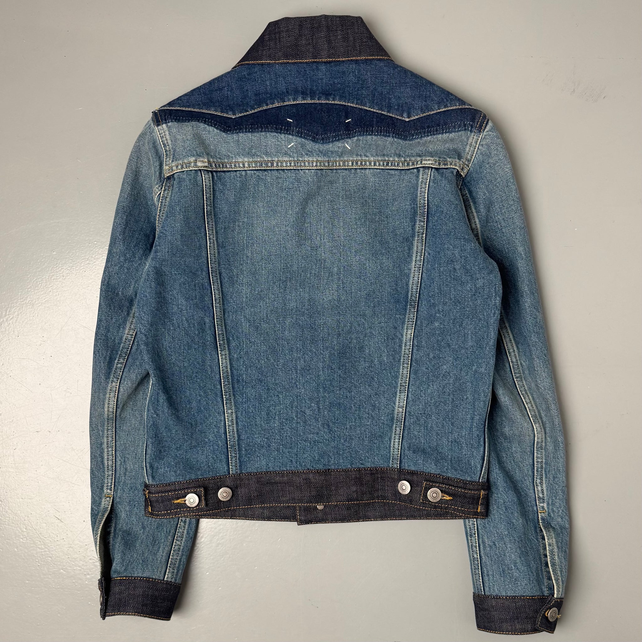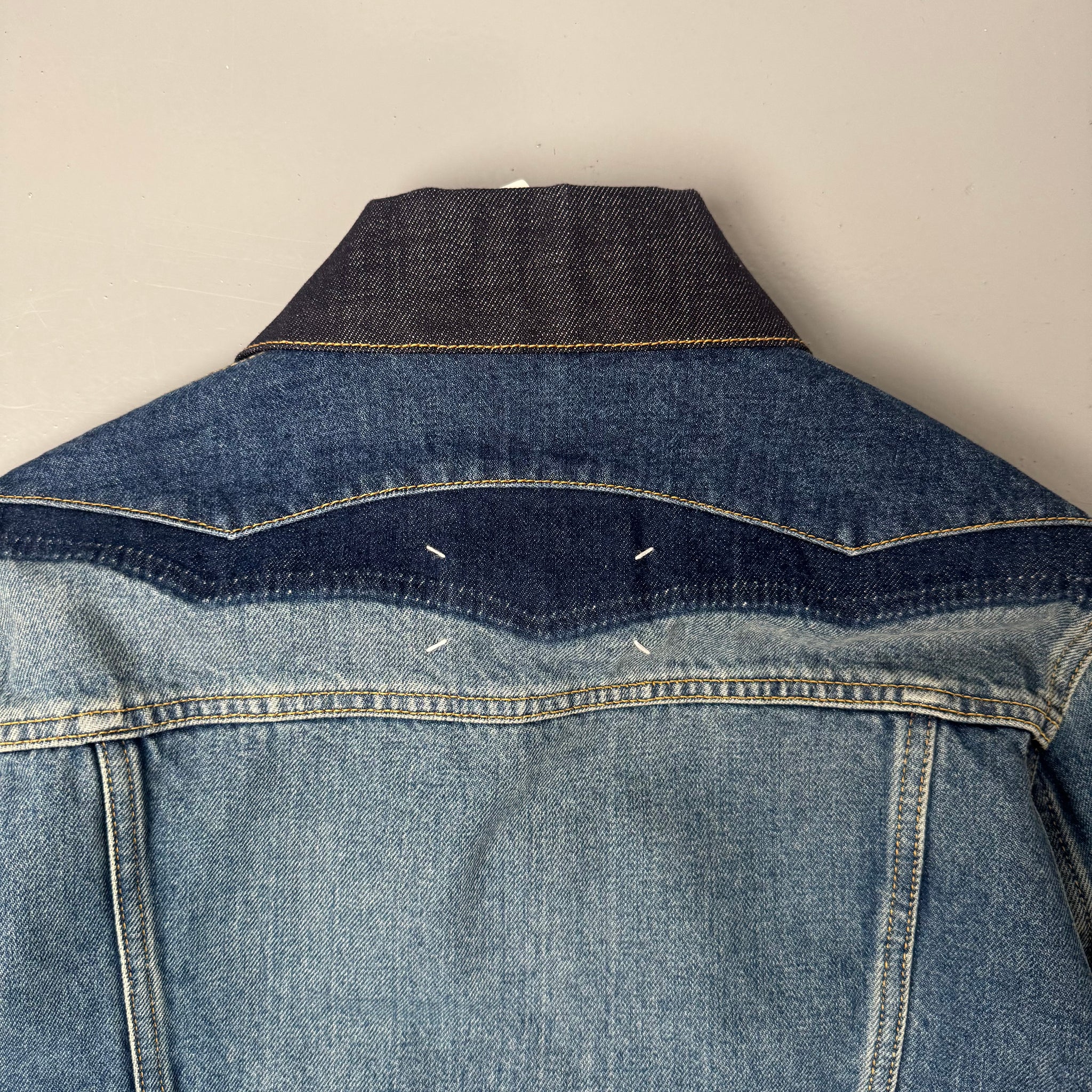 Maison Margiela’s ikoniske denimjakke med de karakteristiske fire hvide stitches på ryggen. Jakken kombinerer 3 nuancer af denim — en lys, vasket blå og en mørkere indigo — som giver et markant, konstrueret udtryk typisk for Margiela’s dekonstruktive tilgang.